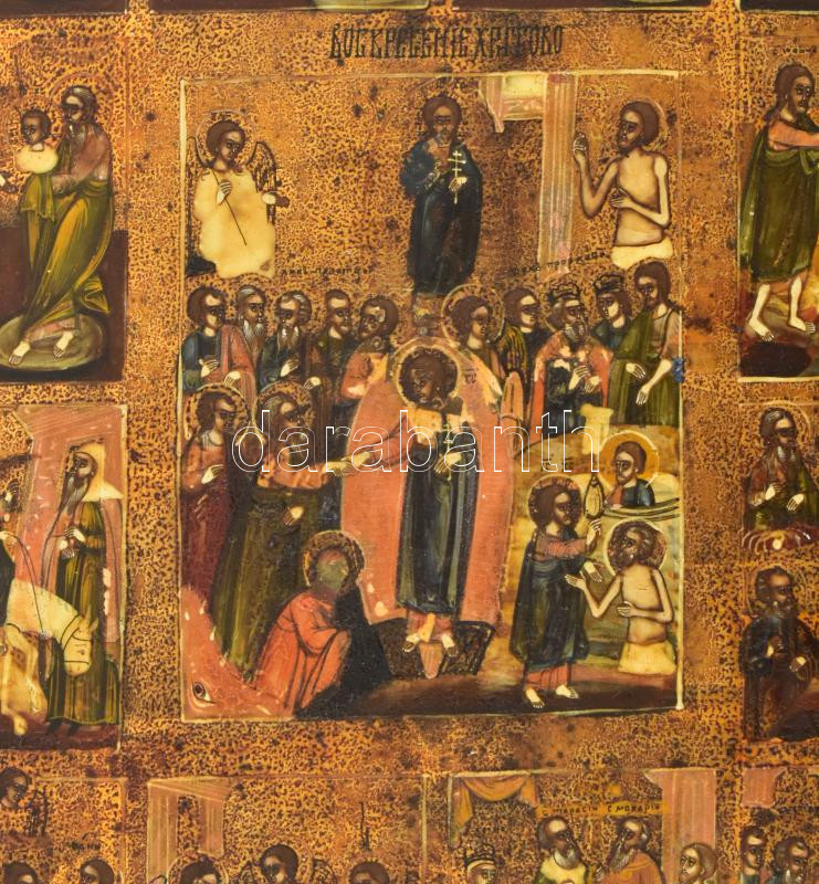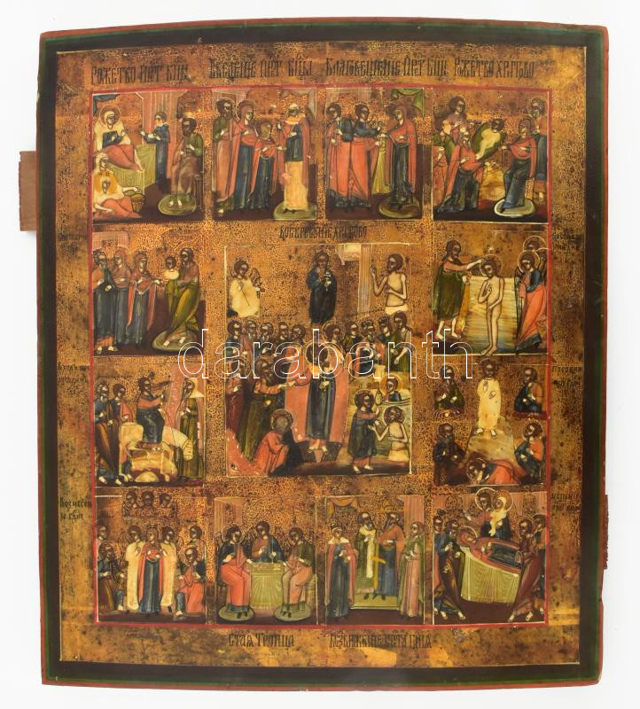 19. századi orosz ikon: Ünnepi ikon. Tojástempera, fa. Hátoldala tisztított. Kis kopással, szép állapot. 31x26 cm