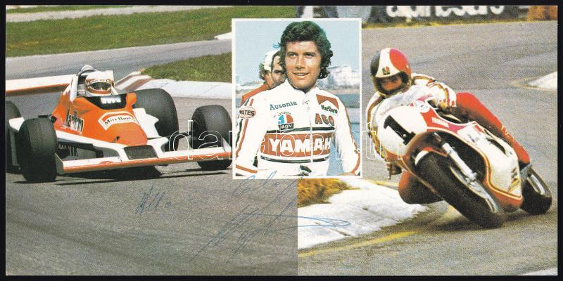 Giacomo Agostini (1942-), olasz motorversenyző, a MotoGP történetének legsikeresebb pilótájának aláírása egy őt ábrázoló nyomtatványon, 10x21 cm