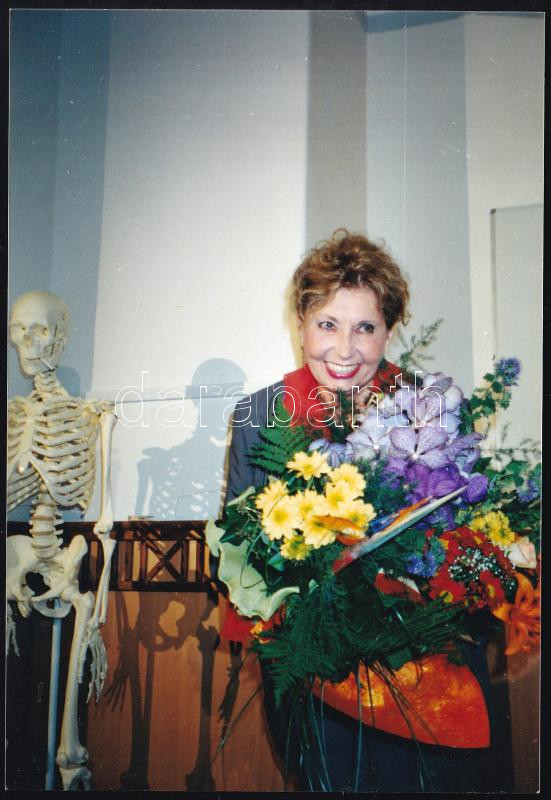 Schubert Éva (1931-2017) Kossuth-díjas színésznő, rendező, érdemes művész aláírása egy őt ábrázoló fotó hátoldalán, 15x10 cm