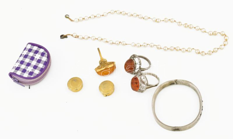Kis bizsu tétel, közte malachitos nyaklánc, borostyános gyűrűk, stb.