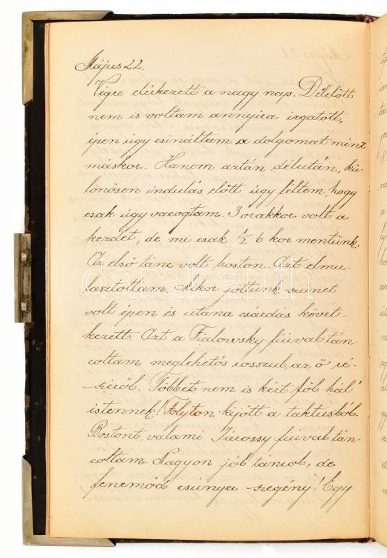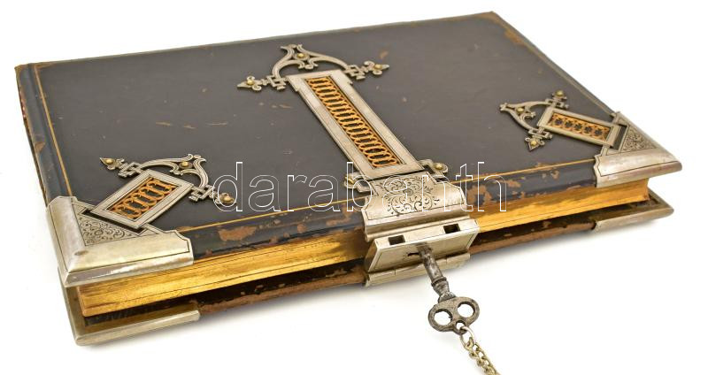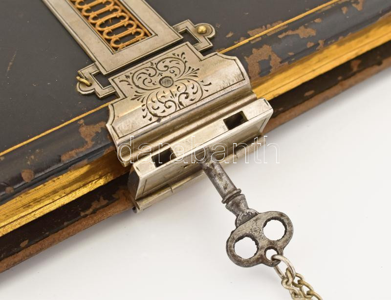 1919-1927 Tinédzser lány naplója, szép kézírásos feljegyzések, korabeli, rendkívül dekoratív, fémveretes egészbőr-kötésben, kulccsal zárható (működő zárral), kopottas borítóval, aranyozott lapélekkel, 19,5x13x2,5 cm