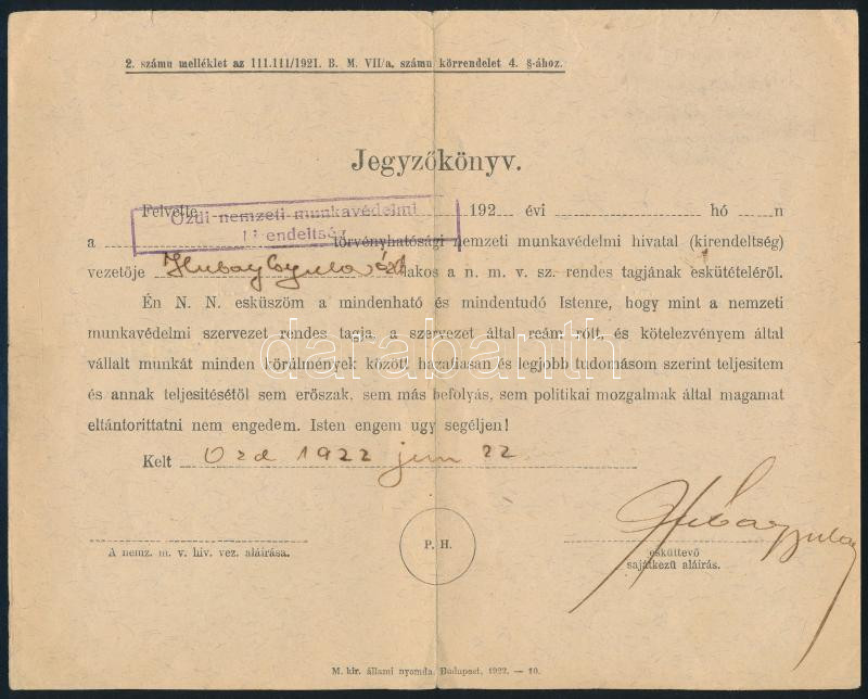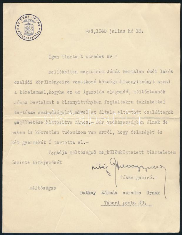 1922-1940 vitéz Hubay Gyula ózdi főszolgabíró által saját kezűleg aláírt 2 db irat (1934-től főszolgabíró; 1952-ben háborús bűntettért 6 évre ítéltek)
