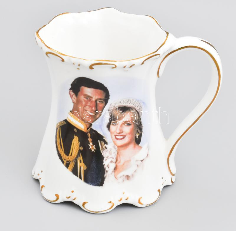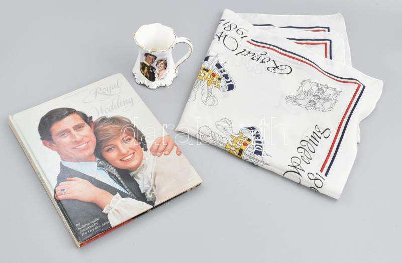 1981 Diana Spencer és Károly herceg esküvőjének 3 relikviája: Royal Wedding című könyv, kis sérüléssel, díszkendő, 65x65 cm, porcelán bögre a pár esküvői képével és információival, hibátlan, m: 10,5 cm