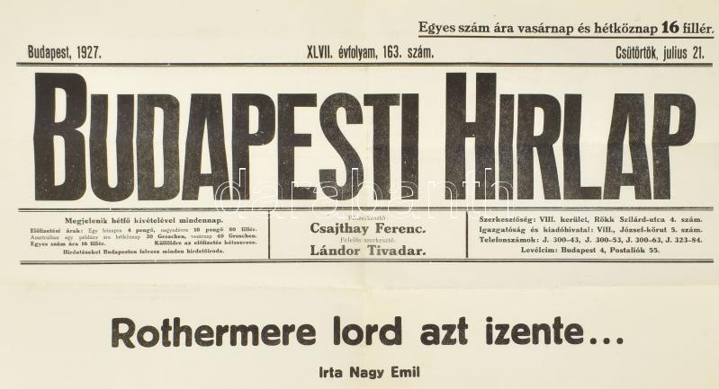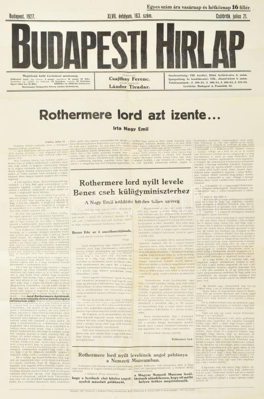 1927 Budapesti Hírlap XLVIII. évf. 163. sz., 1927. július 21., különleges kiadás: Lord Rothermere, a magyar revíziós törekvések támogatójával kapcsolatos írások, nagyméretű plakát formájában. (Benne Nagy Emil írása, ill. Lord Rothermere Edvard Beneš cseh külügyminiszterhez címzett nyílt levelének szövege). Bp., Budapesti Hírlap-ny., jó állapotban, 94x63 cm