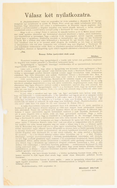 Description: 1929 Hajdúböszörmény, Brassay Zoltán ipartestületi elnök válasza a Hajdúböszörmény c. újságban megjelent nyilatkozatokra, szórólap (egy gépelt oldal, érdekes tartalom), néhány kisebb sérüléssel, 34x20,5 cm
