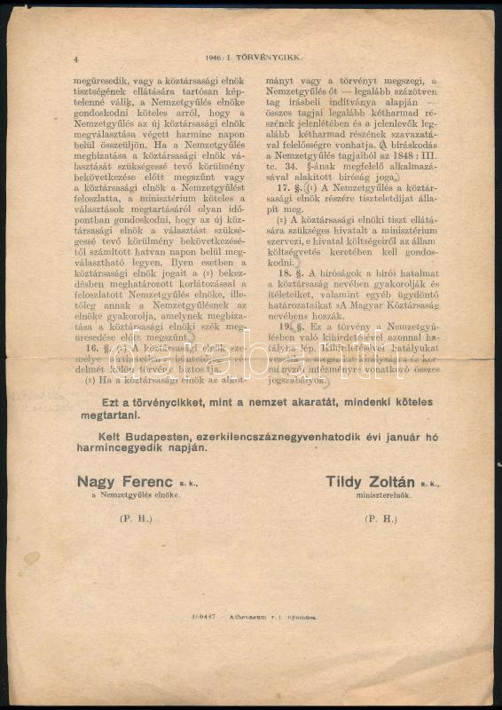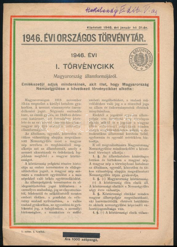 1946. évi I. törvénycikk Magyarország államformájáró, 4p, hajtásnyommal, kisebb szakadásokkal, névbejegyzéssel
