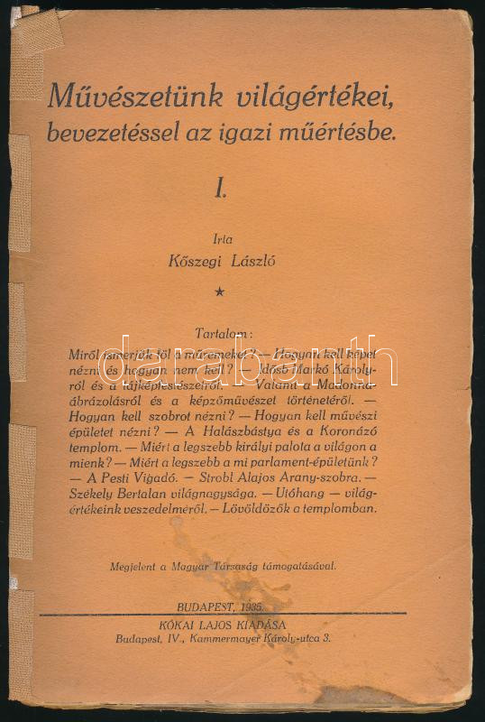Description: Kőszegi László: Művészetünk világértékei, bevezetéssel az igazi műértésbe I. Bp., 1935, Kókai Lajos, 118+(2) p. Kiadói papírkötés, a borítón folttal, sérült borítóval és gerinccel, ragasztott.
