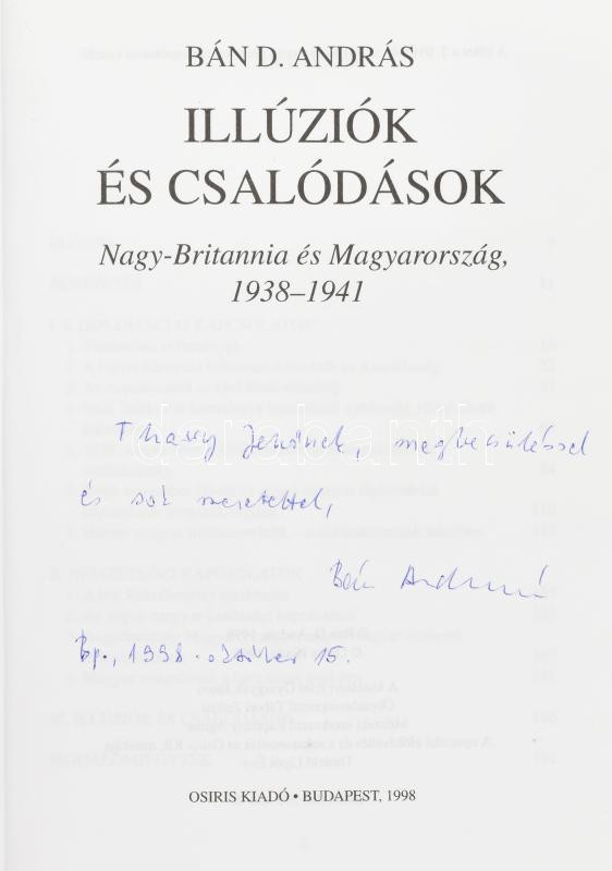 Bán D. András: Illúziók és csalódások (Nagy-Britannia és Magyarország 1938-1941.) DEDIKÁLT! Bp., 1998., Osiris. Kiadói papírkötés.