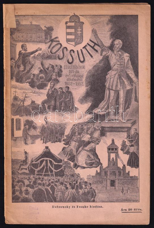 Description: Szalay Mihály: Kossuth Lajos élete. Kossuth születésének századik évfordulója alkalmából a magyar nép és serdülő ifjúsága számára. Bp., 1902., Dobrowsky és Franke, 16 p. Kiadói illusztrált papírkötés, a hátsó borító szakadt.