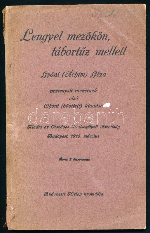 Description: Gyóni (Áchin) Géza: Lengyel mezőkön, tábortűz mellett. Gyóni (Áchim) Géza przemysli verseinek első itthoni (bővített) kiadása. Bp., 1915, Országos Hadsegélyező Bizottság (Budapesti Hírlap-ny.), 64 p. Kiadói papírkötés, sérült gerinccel és borítóval, néhány kevés oldalon apró lapszéli, szöveget nem érintő sérüléssel.