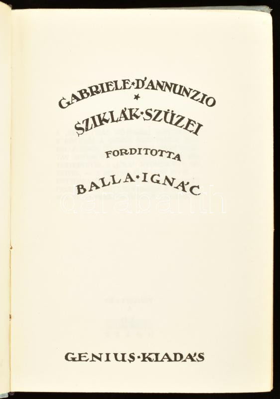 Description: A Regényírás Művészei sorozat 3 kötete: Cholnoky László: Régi ismerős; Miklós Jenő: Madárka; Gabriele D'Annunzio: Sziklák szüzei. Ford.: Balla Ignác. Bp., 1921, Genius. A borító Végh Gusztáv munkája. Kiadói festett egészvászon sorozatkötésben (Gottermayer-kötés), jó állapotban. Számozott (21./100, ill. 24./250) példányok!