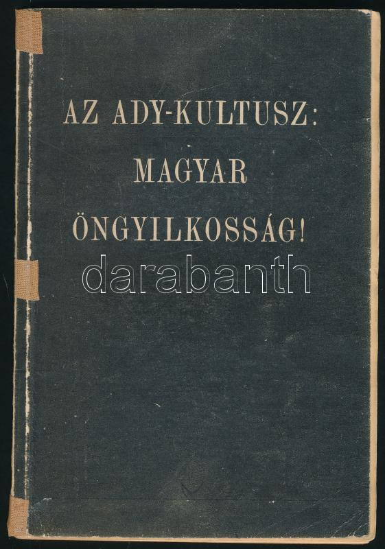 Dr. Bartha József - Kuszkó István - Kovách Géza - KÅ‘szegi László: Az Ady-kultusz: magyar öngyilkosság! Bp., 1941, szerzÅ‘i kiadás (Stephaneum-ny.), 118 p. ElsÅ‘ kiadás. Kiadói papÃrkötés, kissé foltos, kopott borÃtóval, sérült, ragasztott gerinccel. A könyv Ady Endre személyét és költészetét bÃrálta, szélsÅ‘jobboldali, antiszemita nézÅ‘pontból, amellyel már megjelenéskor vihart kavart. A témával kapcsolatban éles vita folyt az idÅ‘szakban, a különbözÅ‘ jobb- és baloldali orgánumok ideológiai állásfoglalásuknak megfelelÅ‘en támogatták, vagy elÃtélték a művet. A háború után a kötet felkerült az Ideiglenes Nemzeti Kormány által 1945/46-ban betiltott, fasiszta és szovjetellenes könyvek listájára.