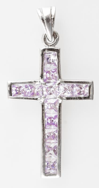 Ezüst(Ag) kereszt medál lila kővel, jelzett, h: 3 cm, bruttó: 2,7 g