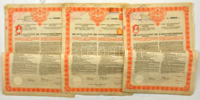 Budapest 1914. "Budapest SzékesfÅ‘város" 4 1/2%-os kötelezvény bemutatóra 480K-ról, magyar és német nyelven, szárazpecséttel, felülbélyegzésekkel, szelvényekkel, vÃzjeles papÃron (3x) T:F