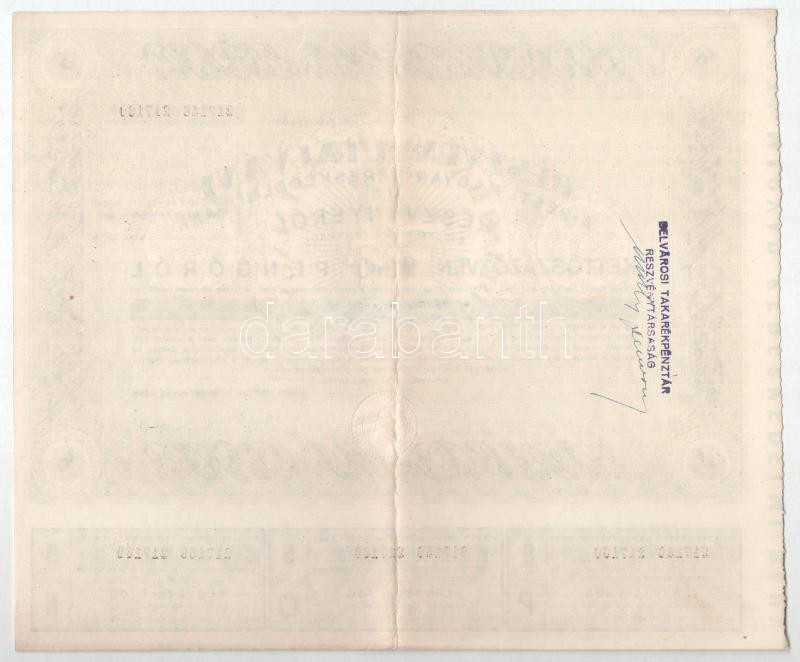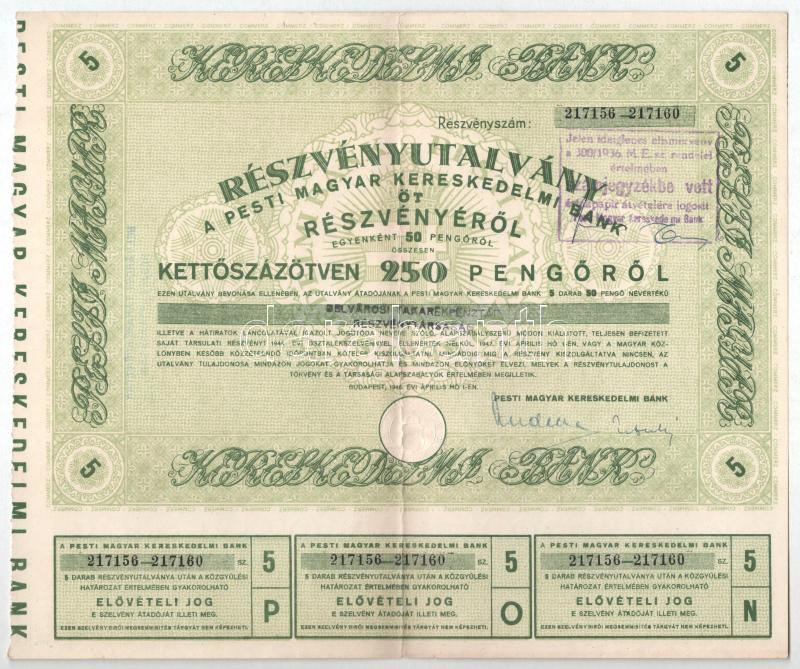 Description: Budapest 1946. "Pesti Magyar Kereskedelmi Bank" részvényutalvány 5 részvényről egyben, összesen 250P-ről, szárazpecséttel, bélyegzéssel, szelvényekkel T:VF
