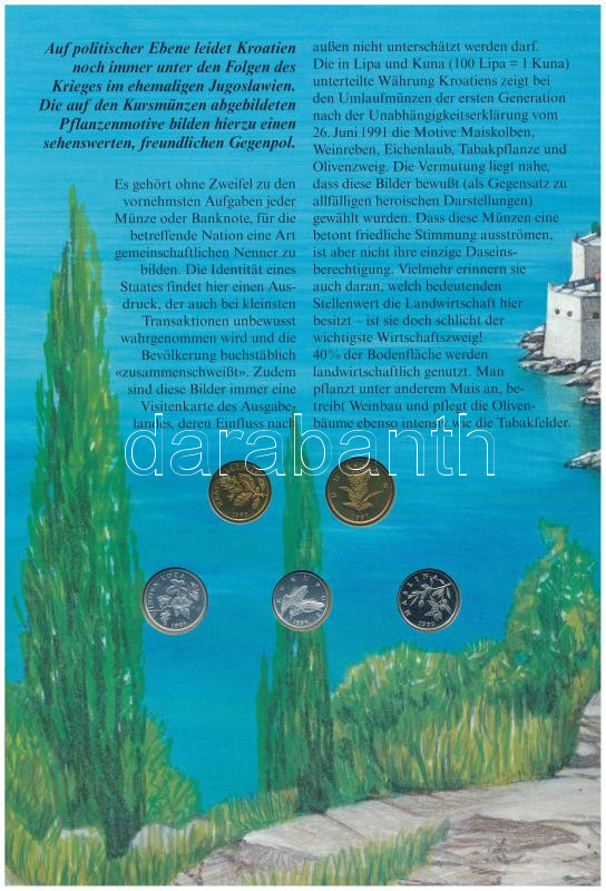 Horvátország 1995-1999. 1l-20l (5xklf) forgalmi összeállítás díszlapon... https://www.darabanth.com/en/443-Online-auction/443.0/Numismatics/Worldwide-silver-and-metal-coins~1500014/Horvatorszag-1995-1999-1l-20l-5xklf-forgalmi-osszeallitas-diszlapon-nemet-nyelvu-taje~II2918302