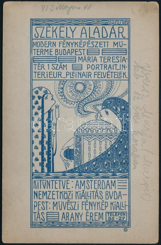 1913 Székely Aladár (1870-1940) modern fényképészeti műtermében készült, keményhátú, vintage fotó Weisz Máriáról, a kép datált, feliratozott és hátlapja szép grafikával illusztrált, 16,2x10,5 cm