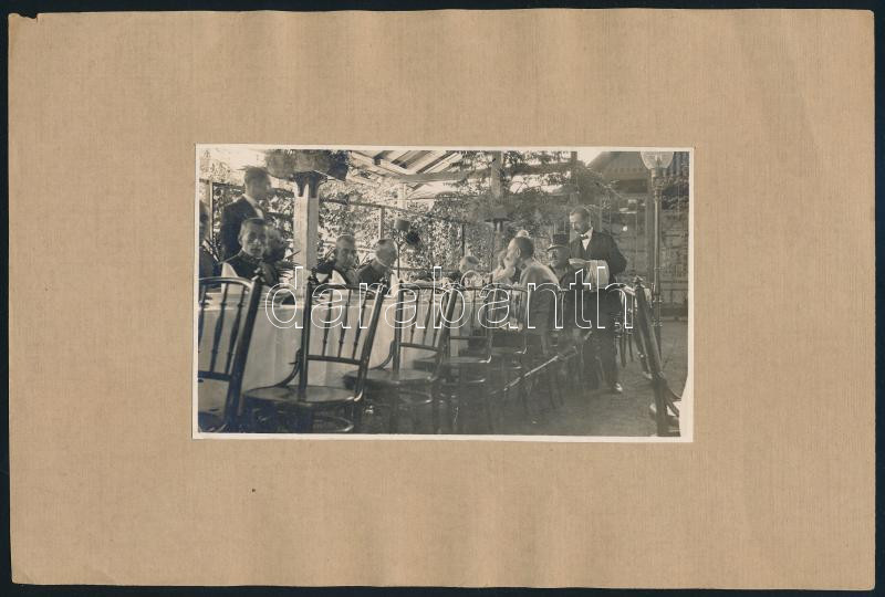 1914 Medgyes (Medias), Erdély, Hotel Traube vendéglőjének kerthelyisége katonatisztekkel, kartonra kasírozott fotó, a hátoldalon feliratozva, 13,5x8 cm
