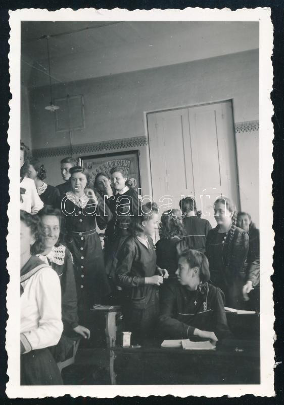 1942 Kolozsvár, Marianum lányiskola, osztályterem diákokkal, hátoldalán feliratozott fotó, jelzés nélkül, 9x6 cm