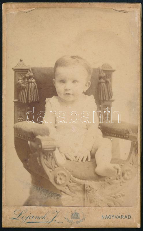 Description: cca 1885 Pál Károly csecsemő kisfiú portréja, Pál Hugóné, született Szóbel Berta és Pál Hugó posta- és távirószámvizsgáló gyermeke, keményhátú fotó Lojanek nagyváradi műterméből, kopott, 10,5×6,5 cm