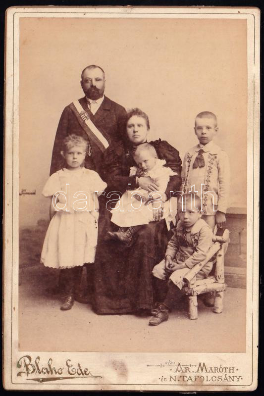 Description: cca 1900 Családi portré, az édesapán magyar címeres, nemzetiszínű vállszalaggal; keményhátú kabinetfotó Blaho Ede műterméből (Ar.Maróth - N.Tapolcsány), 16x10,5 cm