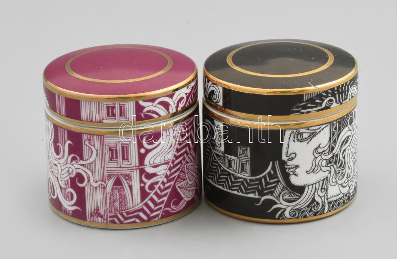 2 darab Hollóházi Szász Endre porcelán tégely, jelzett, hibátlan, fekete és lila változat, m: 5,5 cm