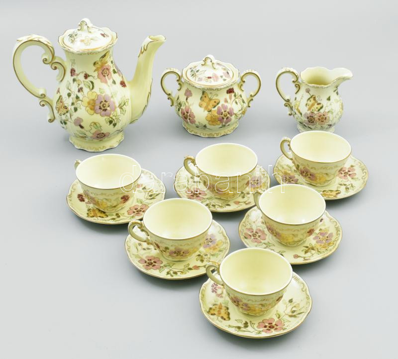 Zsolnay pillangó mintás 6 személyes mokkás készlet. Kézzel festett, jelzett, minimális kopással.