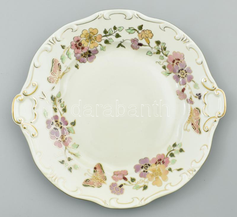 Zsolnay porcelán pillangó mintás süteményes készlet. Kézzel festett, jelzett, hibátlan. d: 17 cm, d: 25 cm