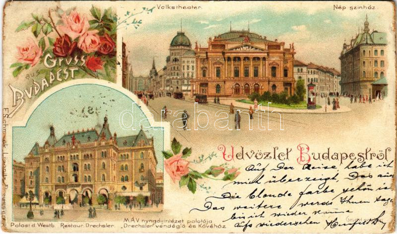 1898 (Vorläufer) Budapest, Népszínház, MÁV nyugdíjintézet palotája, Drechsler vendéglő és kávéház. F. Schmuck Art Nouveau, floral, litho (b)