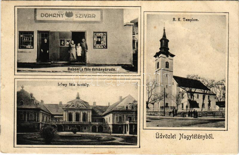 1928 Budapest XXII. Nagytétény, Római katolikus templom, Löwy féle kastély, Babonits Ferenc féle dohány és szivar áruda üzlete és saját kiadása (EB)