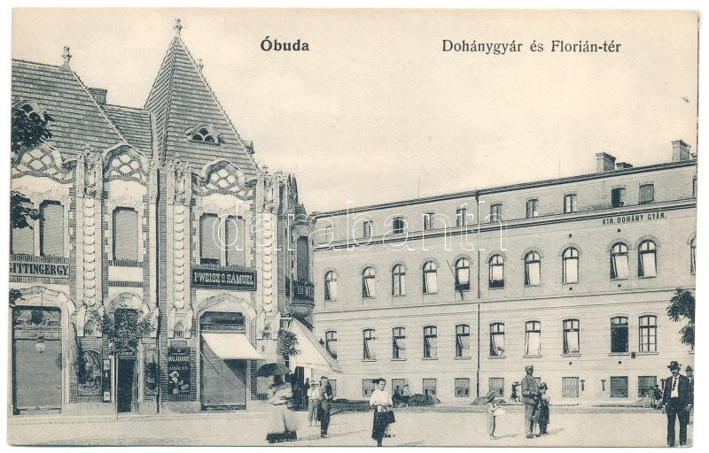 Budapest III. Óbuda, Flórián tér, Vörösvári utca, dohány gyár, Ifj. Weisz S. Sámuel és Gittinger Gy. üzlete. Kohn és Grünhut kiadása (EK)