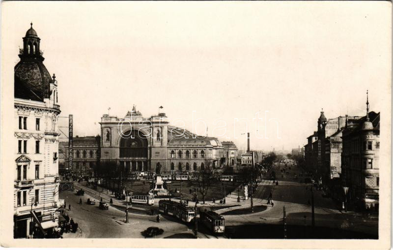 Budapest VII. Keleti pályaudvar, Baross tér és szobor, villamosok, Park Hotel szálloda, dohányáruda üzlet, Hazai takarék