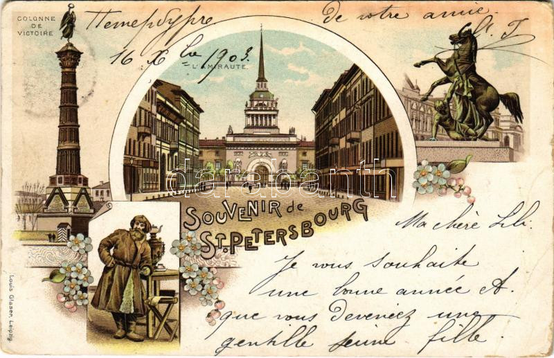 Description: 1903 Saint Petersburg, Petrograd, Leningrad; L'Amiraute, Colonne de Victoire / Admiralty, Alexander Column. Louis Glaser Art Nouveau, floral, litho (EK)