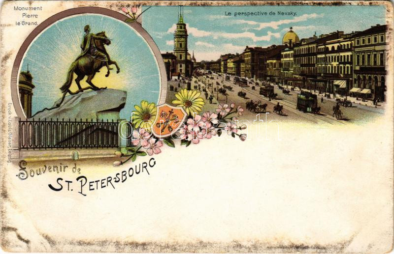 Description: Saint Petersburg, Petrograd, Leningrad; Monument Pierre le Grand, Le perspective de Nevsky / Peter the Great statue, Nevsky Avenue. Louis Glaser Art Nouveau, floral, litho (EK)