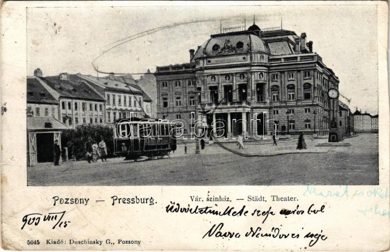 1903 Pozsony, Pressburg, Bratislava; Városi színház, villamos. Duschin...