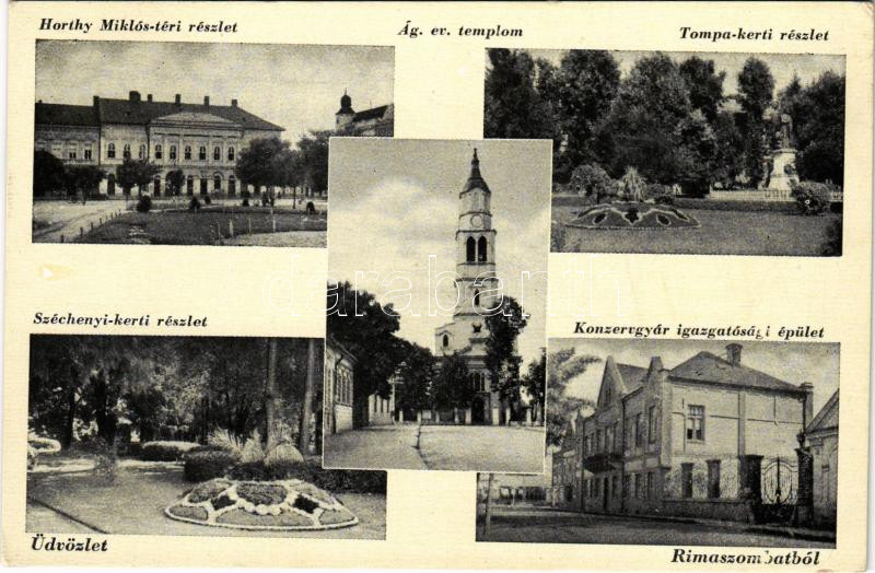 Description: 1940 Rimaszombat, Rimavská Sobota; Horthy Miklós tér, Evangélikus templom, Tompa kert, Széchenyi kert, Konzervgyár igazgatósági épület / square, Lutheran church, park, can factory directorate building (EK)