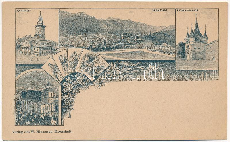 Brassó, Kronstadt, Brasov; Rathhaus, Katharinenthor, Evang. Kirche. W. Hiemesch / Városház, Evangélikus templom, Katalin kapu / town hall, Lutheran church, gate. Art Nouveau, floral (EK)