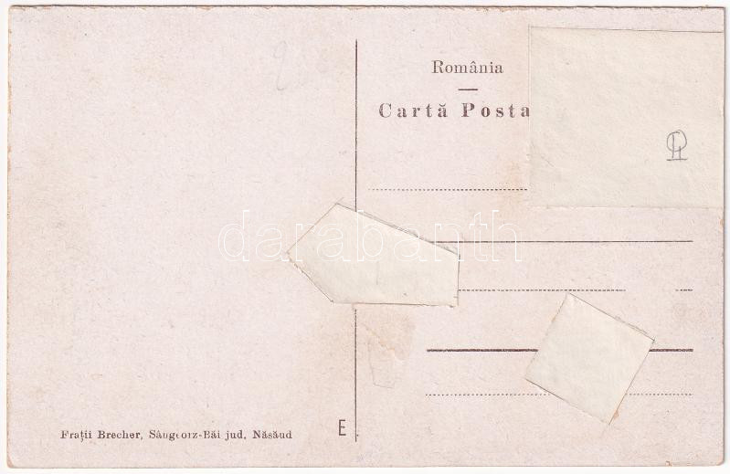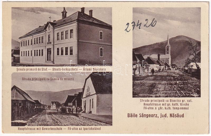 Oláhszentgyörgy, Sangeorgiul Roman, Sangeorz-Bai; Scoala primara de Stat, Strada principala cu Biserica gr. cat., Scoala de meserii / Állami népiskola, Fő utca, Görögkatolikus templom, Ipariskola, Brecher Testvérek üzlete és saját kiadása / schools, main street, Greek Catholic church, publisher's shop, automobile (r)