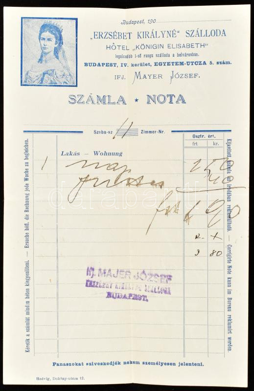 1900 Budapest Erzsébet királyné szálloda számla a királyné arcképével
