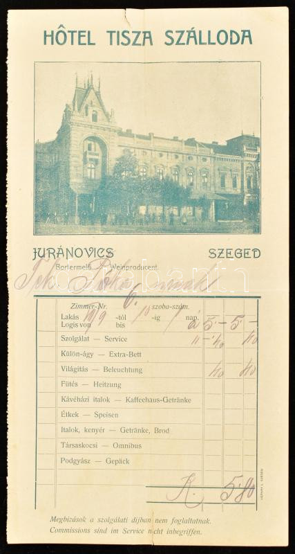 1900 Juránovics, Hotel Tisza, Szeged. képes számla