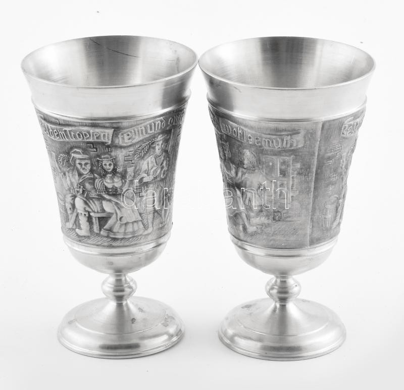 2 darab kocsmai jelenetes ón díszpohár, jelzett, kopásokkal, m: 12 cm