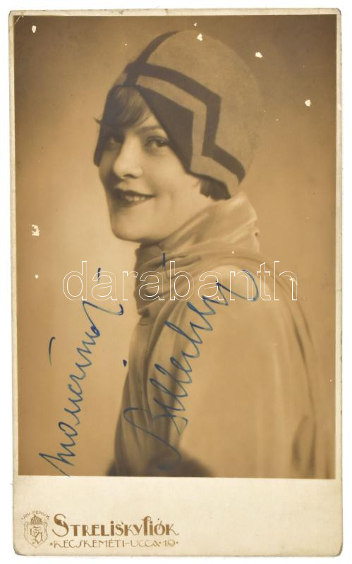 Biller Irén (1897-1989) színésznő aláírása egy őt ábrázoló képeslapon.