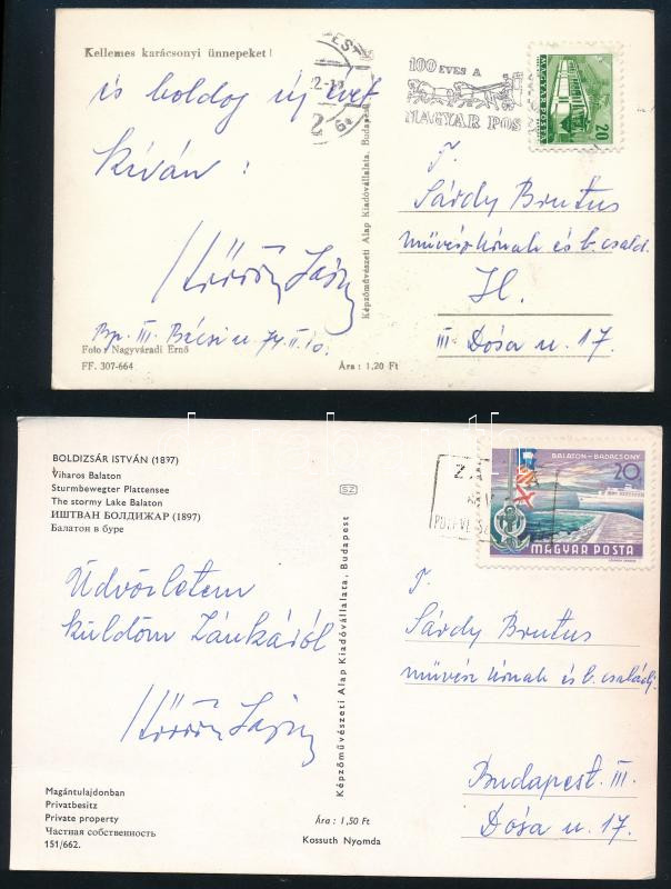 Description: Körösy Lajos (1910-1967) erdélyi magyar festöművész 2 db autográf levelezőlapja Sárdy Brutus (1892-1970) festőművész, restaurátor részére, Körösy Lajos autográf aláírásával