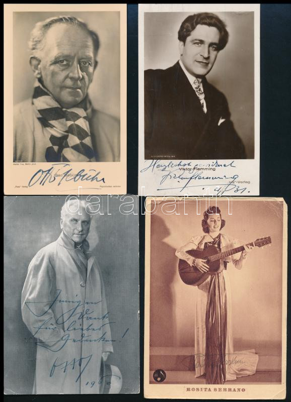 Külföldi hírességek aláírt fotói, 4 db: Viktor Flemming filmrendező, Otto Gebühr színész, Rosita Serrano énekesnő + egy azonosításra váró