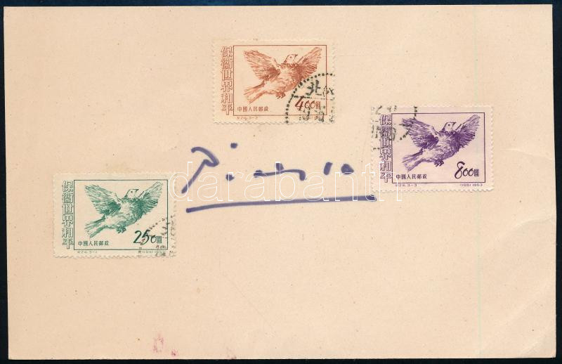 Description: Pablo Picasso (1881-1973) festő- és képzőművész autográf aláírása az általa tervezett kínai, Békegalambot ábrázoló bélyeg mellett / Autograph signature of Pablo Picasso (1881-1973) painter next to a stamp with his painting teh Peace-dove 17x11 cm