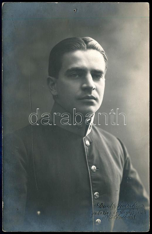 Description: cca 1900-1910 Kürthy György (1882-1972) színész, színházigazgató, díszlettervező (Vízvári Mariska színésznő férje) autográf aláírása őt ábrázoló fotólapon (Kolozsvár, Dunky Fivérek fényképészete), 14x9 cm