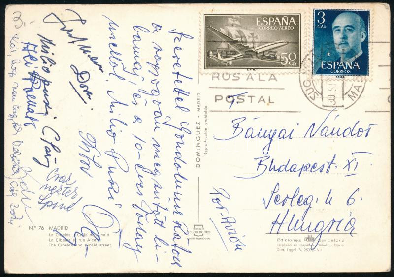 cca 1965 Puskás Ferenc és másol által írt képeslap Bányai Nándor labdarúgó részére