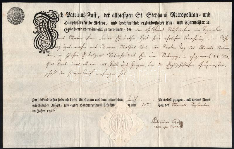 1786-1787 Bécs, német nyelvű keresztlevél, papírfelzetes viaszpecséttel