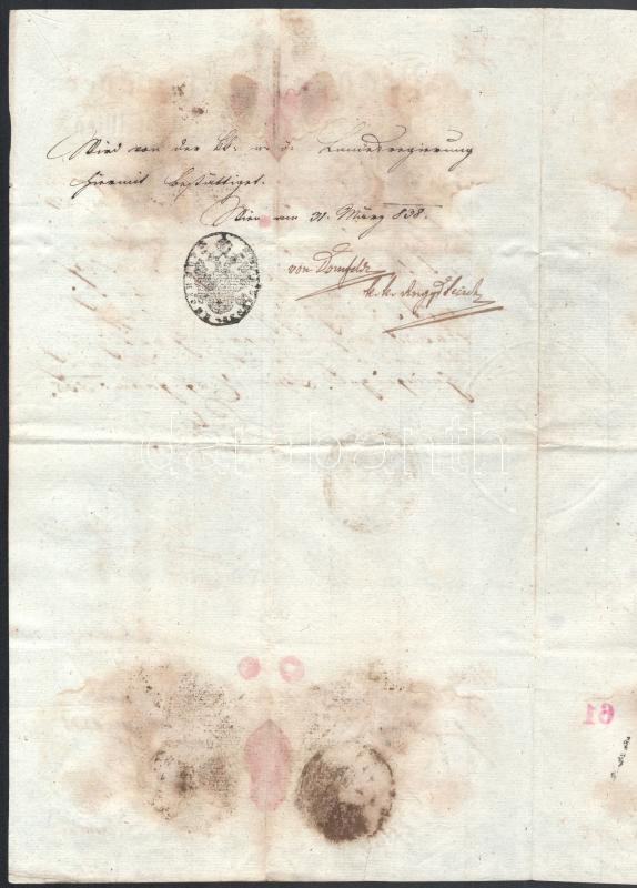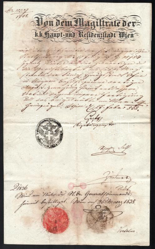 1838 Bécs, német nyelvű elbocsátó levél, foltos, hajtott, pecsétekkel.