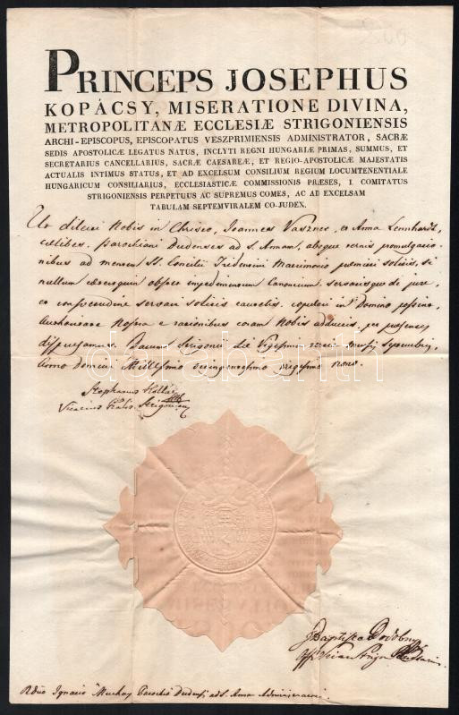 1839 Esztergom, Kopácsy József (1775-1847) esztergomi érsek nevével el... https://www.darabanth.com/en/444-Online-auction/444.0/Art-and-other-collectibles/Documents~500022/1839-Esztergom-Kopacsy-Jozsef-1775-1847-esztergomi-ersek-nevevel-ellatott-egyhazi-iratok-v~II2927676